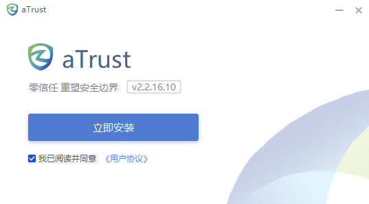 用户双击打开名为aTrustInstaller的客户端软件,在软件安装界面查看用户协议后,勾选“我已阅读并同意”后点击安装界面的 “立即安装”按钮,开始安装。