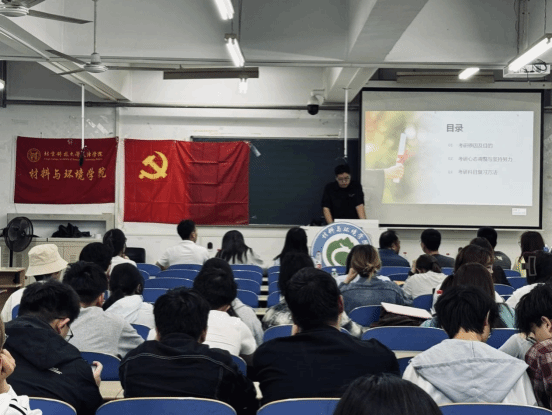 材料与环境学院党总支书记张飞鹏老师发表讲话,首先对成功上岸和通过四级考试的同学们表达了祝贺,希望他们不忘初心,赓续奋斗。并对其他与会学生提出期望:考研不仅是关乎个人发展的重要抉择,更是推动学风建设的核心动力。期待同学们锚定考研目标,以勤勉之姿深耕学业,共同培育浓厚向学之风。同时,建议大家将英语学习与个人志趣、专业特色相融合,科学规划职业发展路径,精准锚定考研方向,续写学院考研新辉煌。