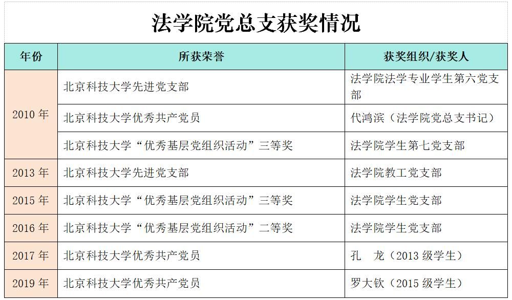 二十年来,法学院高度重视党建和思想政治工作,先后荣获北京科技大学先进党支部两次;北京科技大学“优秀基层党组织活动”二等级一次、三等奖两次;北京科技大学优秀共产党员三人次。重视辅导员队伍建设,推行分类管理模式,针对不同年级、专业、性格特点的学生制定个性化管理策略,确保每位学生都能在适宜的环境中成长,努力成为学生成长路上的引路人。