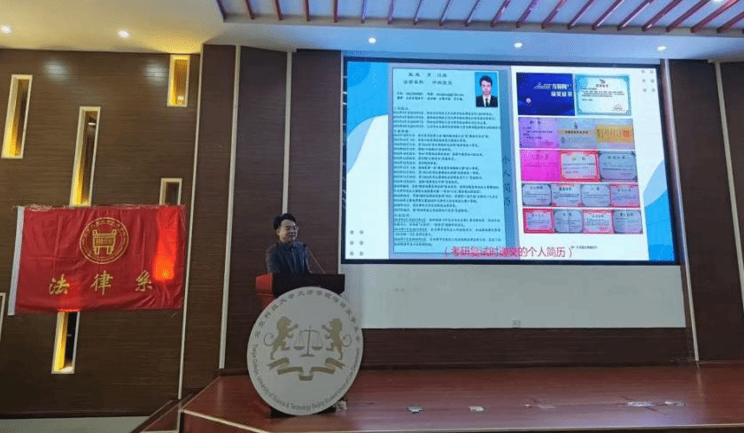2017届法学专业毕业生孔龙从自己的校园成长之路讲起,感叹再次站上学术报告厅演讲台的心情变化。之后与学弟学妹们分享了自己的学生干部、考研备考、学术科研、律所工作和恋爱家庭的经历,用自己毕业后学习、生活、工作的经历来鼓励同学们坚守理想、锤炼本领、发挥所长、不断奋进、永不言败,让人不禁感叹努力的人自带光芒。