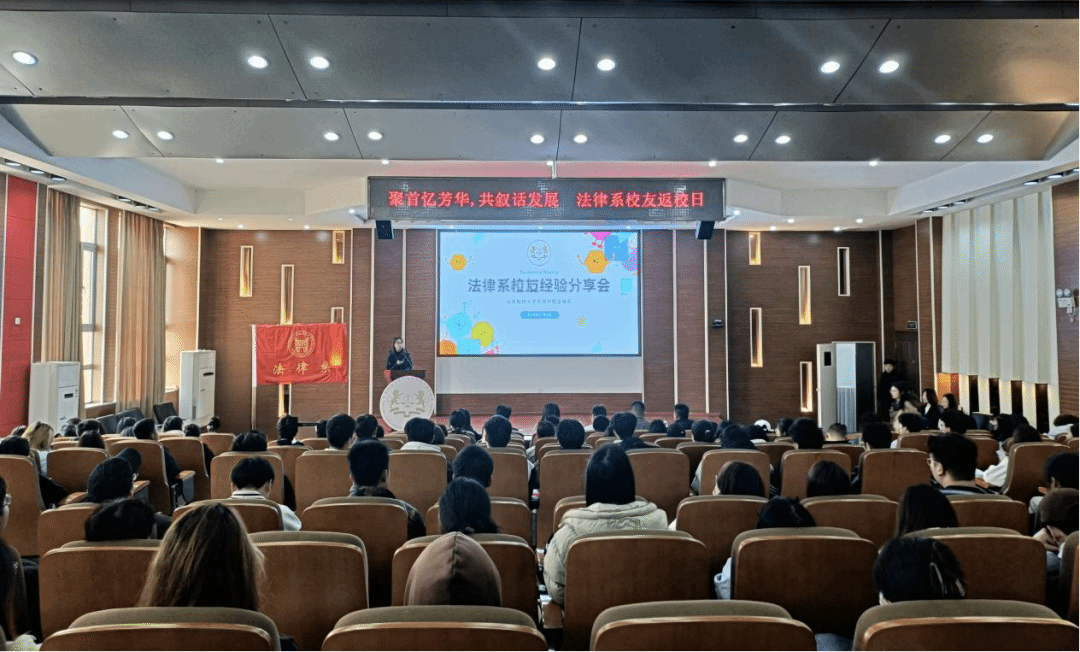 活动当天上午,在理工图书馆学术报告厅由党总支书记张莉主持举办了校友经验分享会,法律系各年级约150名同学现场聆听了学长学姐的分享。2014届法学专业毕业生王欣宇、2017届法学专业毕业生孔龙、2018届法学专业毕业生刘远航进行分享,校友们结合各自不同的境遇与心境,分享了成为一个“大人”的收获和感触,句句话语流露出对母校师长的感恩、对校园生活的怀念、对学弟学妹的希冀。