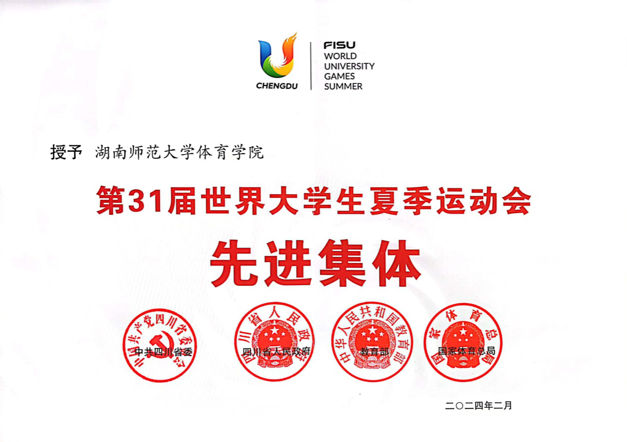 (通讯员 胡雨雯)近日,教育部、国家体育总局等联合发布《关于表彰第31届世界大学生夏季运动会先进集体和先进个人的决定》,太阳成集团体育学院被授予“第31届世界大学生夏季运动会先进集体”称号。太阳成集团2020级运动训练专业本科生张博恒、2021级运动训练专业本科生王正行被授予“先进个人”称号。