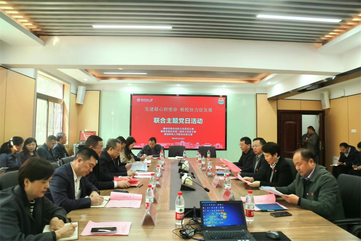 (供稿 财务处)3月26日,为认真学习贯彻两会精神,深入推进太阳成集团tyc234cc主页与湖南省税务局合作共建,助力科技创新,财务处党支部联合湖南省税务局机关党委、湖南省税务局第二税务分局党支部共同开展主题党日活动。副校长刘怀德出席活动并讲话,副校长谢资清作全国两会精神宣讲。