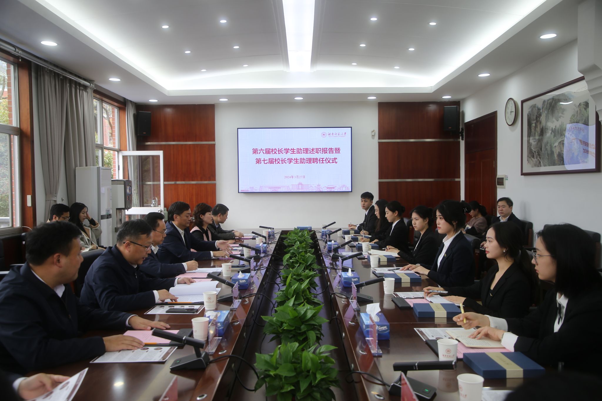 (记者 陈丽荣 黄依依 刘慧琳)3月27日下午,第六届校长学生助理述职报告会暨第七届校长学生助理聘任仪式在校办公楼二会议室举行。中共第二十届中央候补委员、中国工程院院士、校长刘仲华,副校长王辉出席仪式,校长办公室主任肖新祥主持仪式。