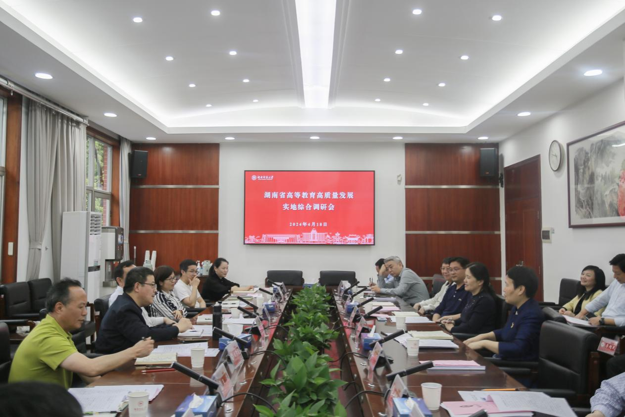 (供稿 发展规划与学科建设处)4月18日下午,省委改革办改革三处处长罗琛、省教育厅高教处处长刘奇军等一行来校开展湖南省高等教育高质量发展实地综合调研座谈,座谈会在校办公楼二会议室举行。副校长谢资清出席调研活动。座谈会由发展规划与学科建设处处长孙岳兵主持。