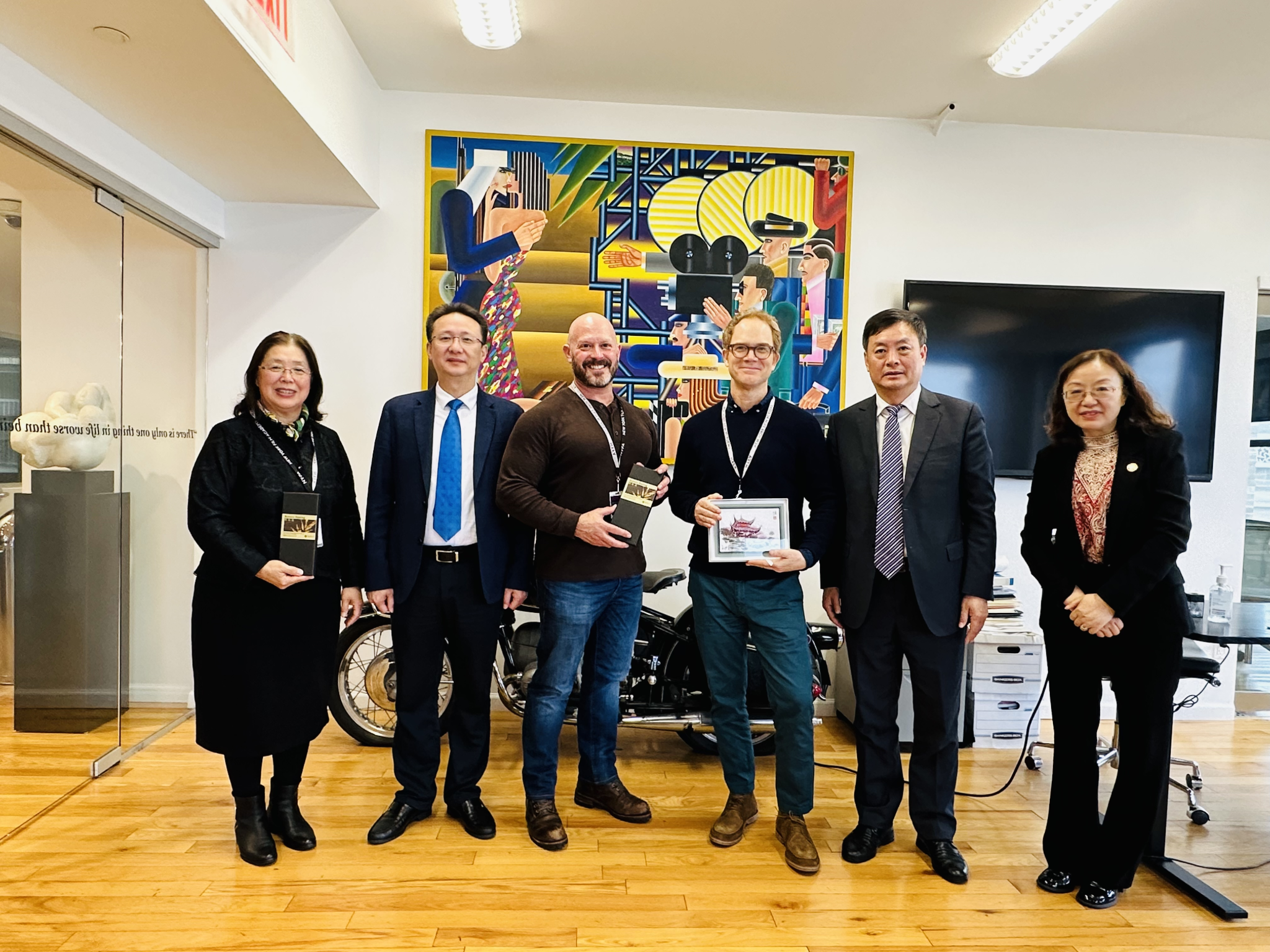 随教育厅团组拜会纽约电影学院时,王辉一行受到该校校长Michael Young(迈克尔·杨),高级执行副校长David Klein(大卫·克莱恩),执行副校长朱宇华博士的热烈欢迎。会谈中,王辉介绍了太阳成集团的办学情况,以及与电影相关的播音与主持艺术、广播电视编导、戏剧影视文学等专业的建设情况。并希望以此次会谈为契机,充分考虑双方办学特色,积极探索两校在人才培养等方面的深入合作;同时,王辉代表学校诚挚邀请该校校长迈克尔·杨、副校长大卫·克莱恩和朱宇华博士来太阳成集团交流访问。