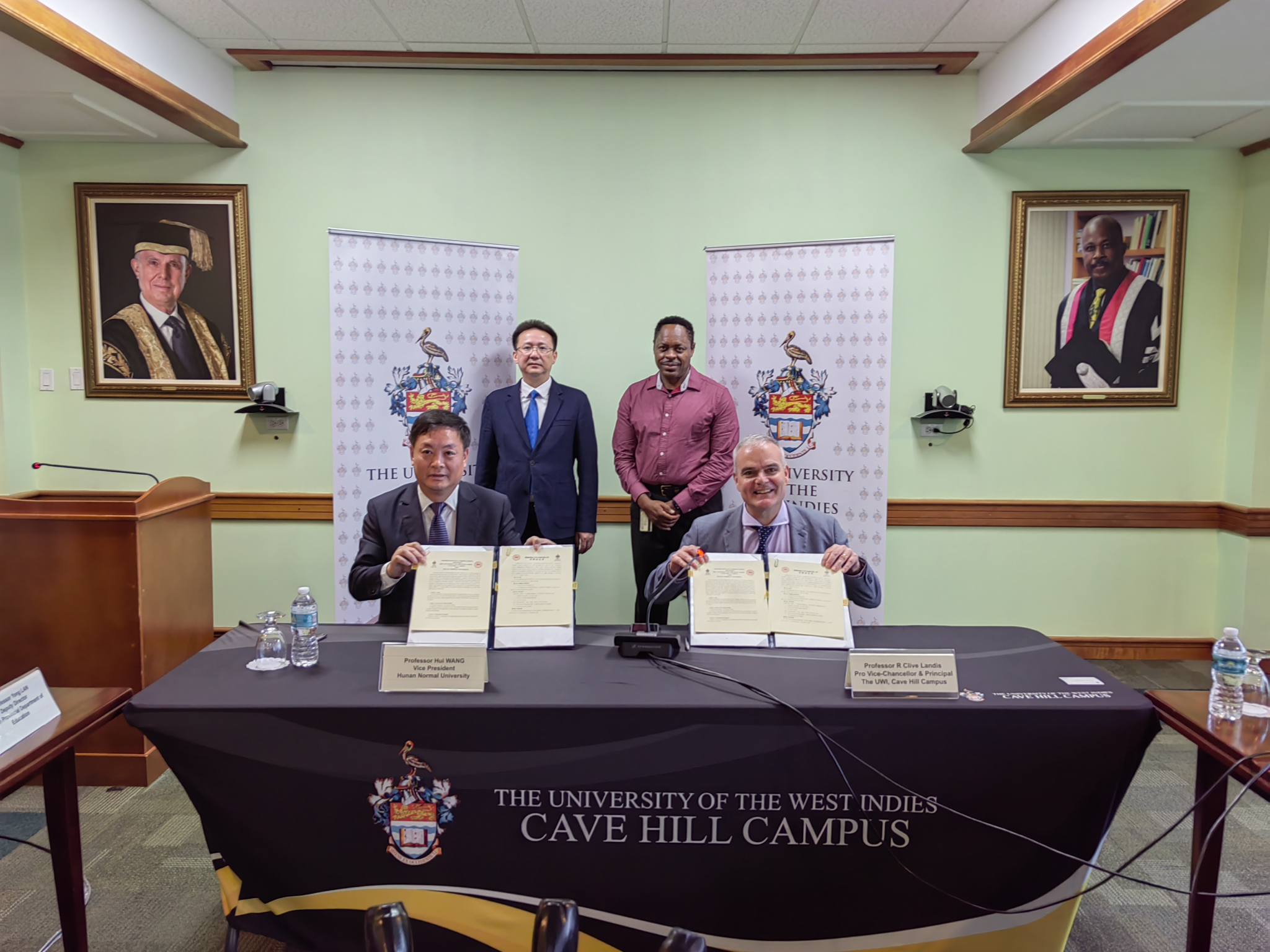 在巴巴多斯期间,王辉随教育厅团组一行拜会了西印度大学凯夫希尔分校,并与该校校长克莱夫·兰迪斯签署了两校合作备忘录。在签署仪式上,王辉简要地介绍了太阳成集团办学情况,并表示,西印度大学是加勒比地区的一流大学,培养了一大批杰出领导人和精英。希望两校以此次签署合作备忘录为起点,在医学、人文和社会学科等领域开展学术交流、科研合作,也欢迎西印度大学的学生来太阳成集团交流学习,同时代表学校诚邀兰迪斯校长来太阳成集团交流访问。