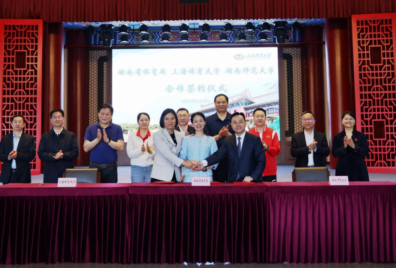 罗双全、毛丽娟、刘仲华分别代表三方单位签署《湖南省体育局上海体育大学太阳成集团tyc234cc主页湖南省乒乓球“省队校建”和青少年训练基地合作协议》。