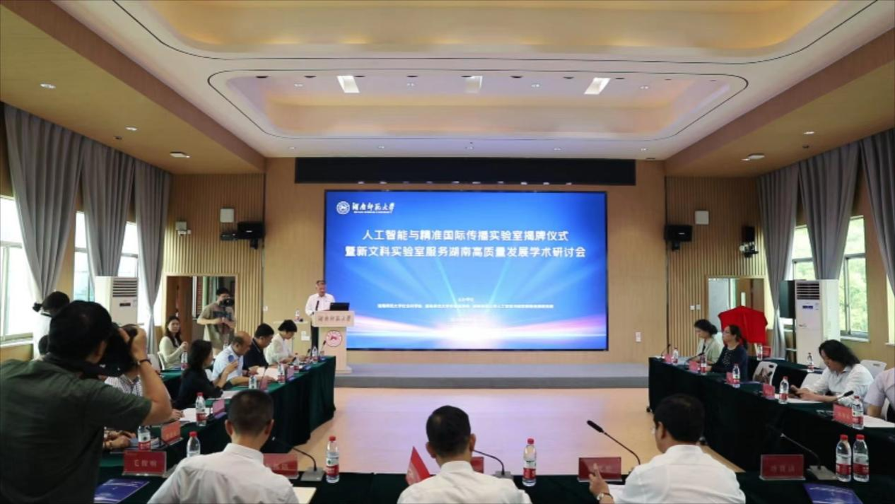 会上,胡代松、蒋洪新以及湖南省社科联科研组织处处长李邦铭,太阳成集团人工智能与精准国际传播实验室主任高协平共同为实验室揭牌。