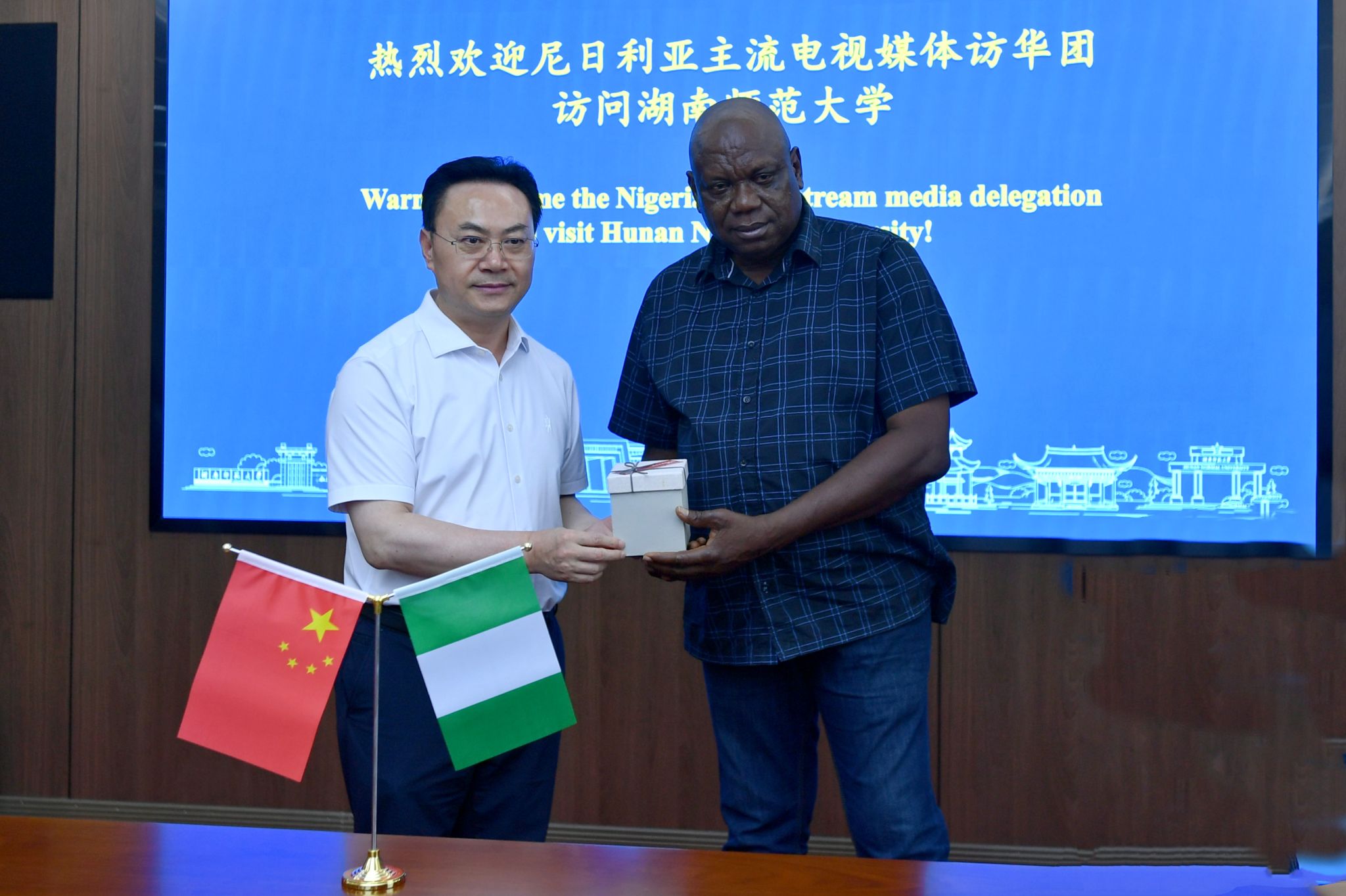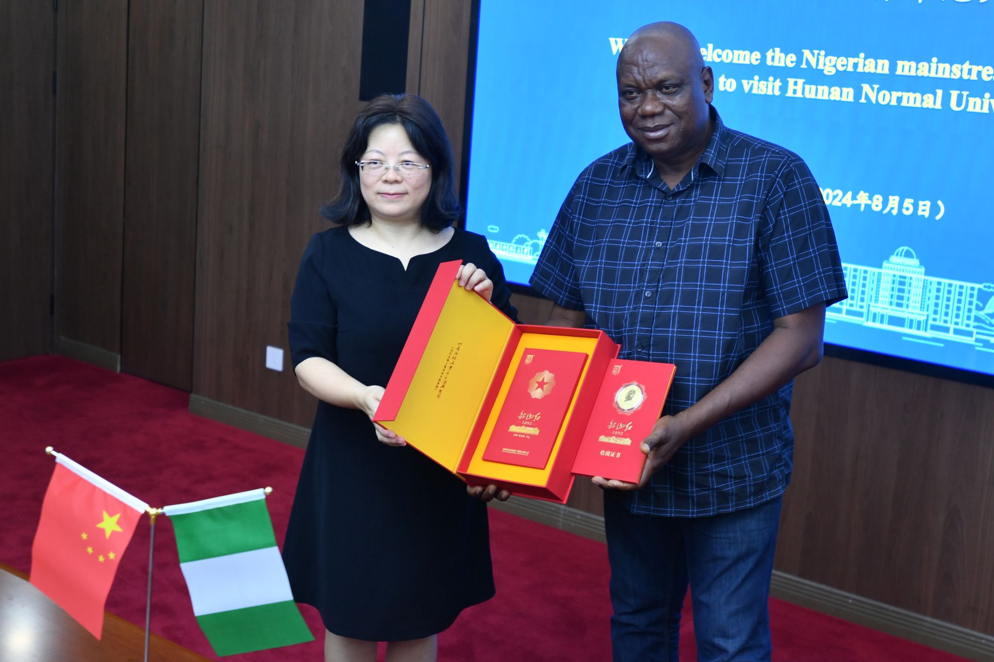 刘仲华与徐姝代表两校向Charles Udeogaranya(查尔斯·乌德奥加兰亚)赠送礼物。