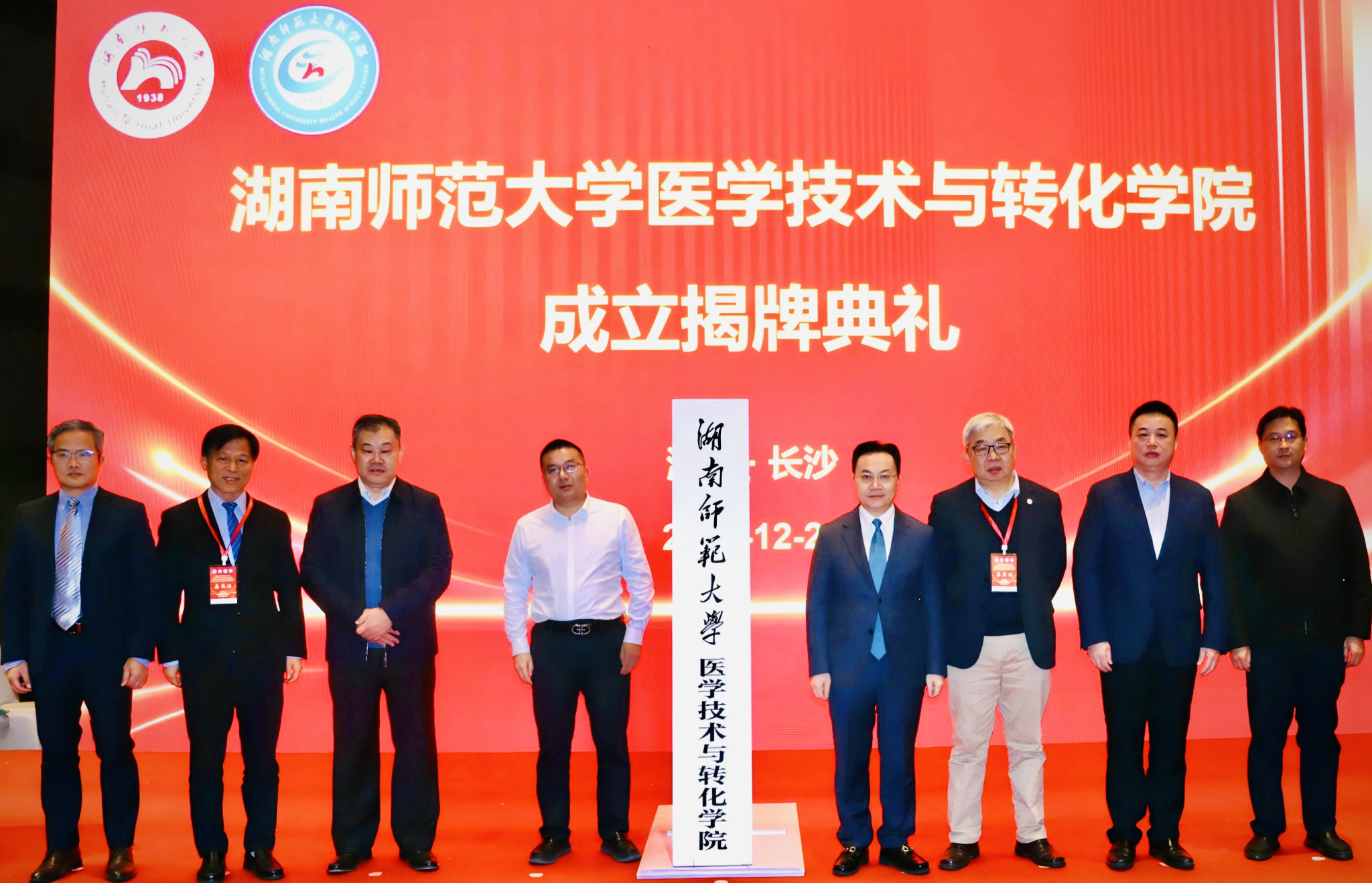 刘仲华、程博、刘志敏、周谋望、赵卫华、祝益民、医学部副主任、医学部医学人才与学科建设处处长孙岳兵、医学技术与转化学院副院长叶湘漓共同为医学技术与转化学院成立揭牌。