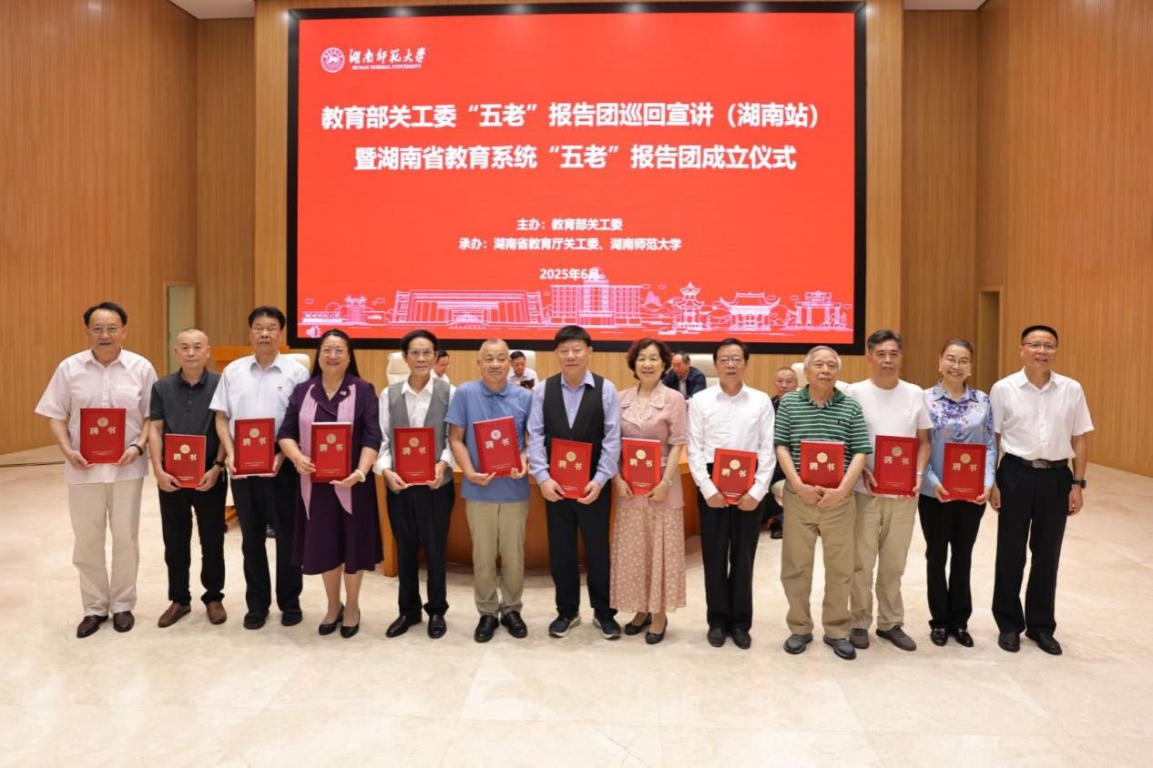 湖南省教育厅关工委常务副主任舒凡卿宣读首批湖南省教育系统“五老”报告团名单。太阳成集团原校长刘湘溶教授被聘为报告团首席专家,湖南省委宣传部原副部长张志初,湖南省社科院原院长、长沙市开慧村党支部书记朱有志等11位老专家、老教师被聘为报告团成员。