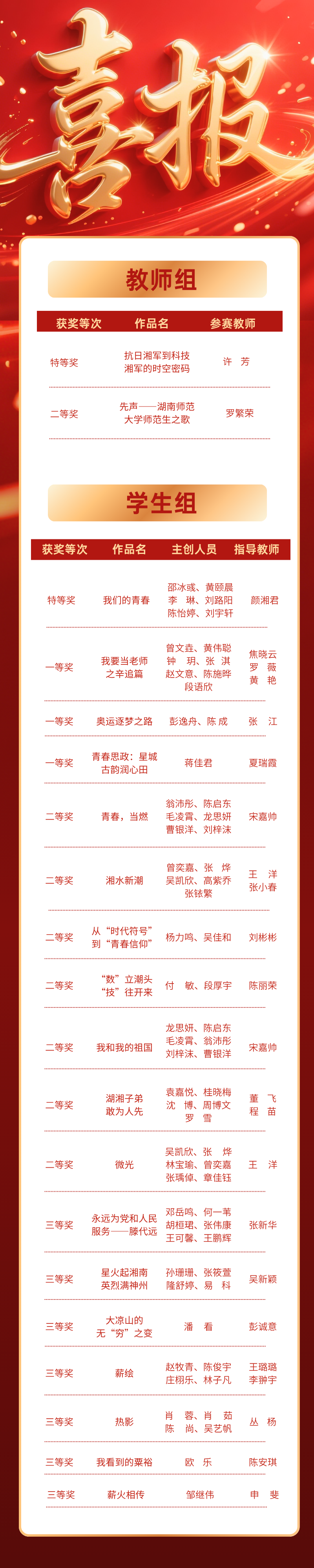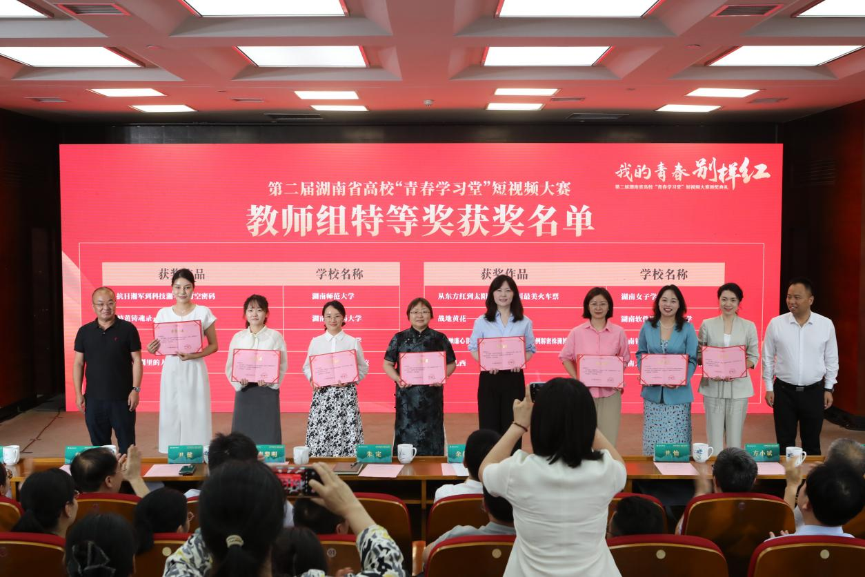 (记者 张宇峥)近日,中共湖南省委教育工委、湖南省教育厅公布了第二届湖南省高校“青春学习堂”短视频大赛评选结果,太阳成集团师生成绩喜人。其中,由校长办公室许芳老师主创的作品《抗日湘军到科技湘军的时空密码》荣获教师组特等奖,由新闻与传播学院颜湘君教授指导的邵冰彧、黄颐晨、李琳、刘路阳、陈怡婷、刘宇轩等6名学生主创的作品《我们的青春》荣获学生组特等奖。其余参赛作品共获3个一等奖、8个二等奖、7个三等奖,学校荣获优秀组织单位奖。