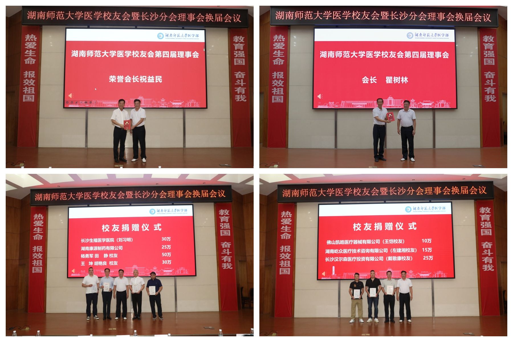 校友捐赠仪式上,王辉为长沙生殖医学医院院长刘习明、湖南康源制药有限公司、杨勇军-田静伉俪校友、王坤-胡艳良伉俪校友、佛山凯皓医疗器械有限公司王恺校友、湖南屹众医疗技术咨询有限公司左建湘校友、长沙汉尔森医疗投资有限公司戴敬康校友等颁发捐赠证书。