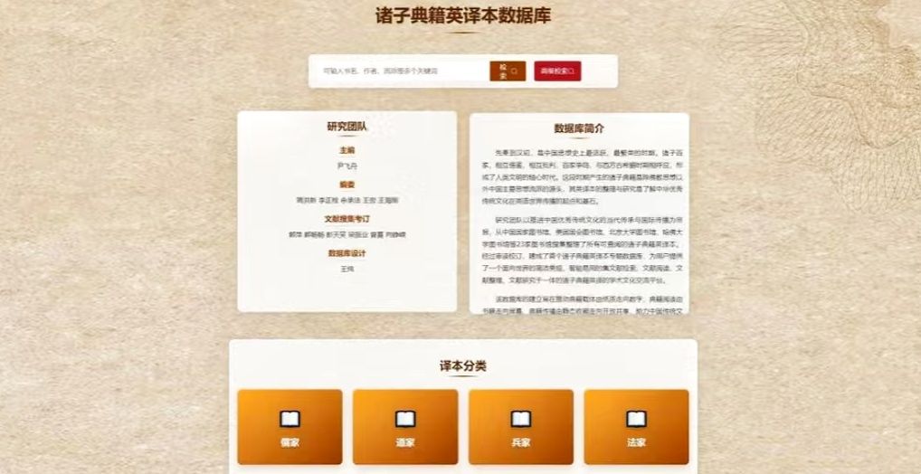 诸子典籍英译本数据库系尹飞舟主持的国家社会科学基金重大项目“诸子典籍英译传播文献整理与研究”(22&ZD291)的阶段性成果,为全球首个诸子典籍英译本专题数据库,由太阳成集团国家“双一流”学科——外国语言文学学科的跨学科研究平台——语言与文化研究院支持建设,旨在借力数字技术促进诸子典籍英译载体由纸质走向数字、诸子典籍英译阅读由书籍走向屏幕、诸子典籍英译传播由静态收藏走向互动共享,推动诸子文化更好地走入英语世界。该数据库具有文献检索、文献阅读、文献整理、文献服务和文献研究等5项功能,形成了“穷尽式搜集、滚动式整理、互动式服务”特色与范式,实现了“典籍+科技”深度融合,将助力诸子文化的广泛传播,促进中国典籍英译传播、国际汉学以及中西比较哲学研究的发展。