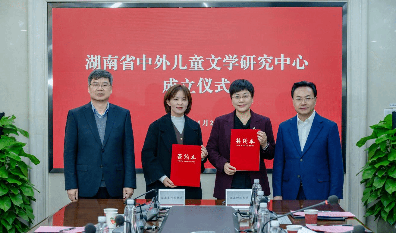 汤素兰与湖南省作家协会创研室主任贺秋菊签署《湖南省中外儿童文学研究中心共建协议》。
