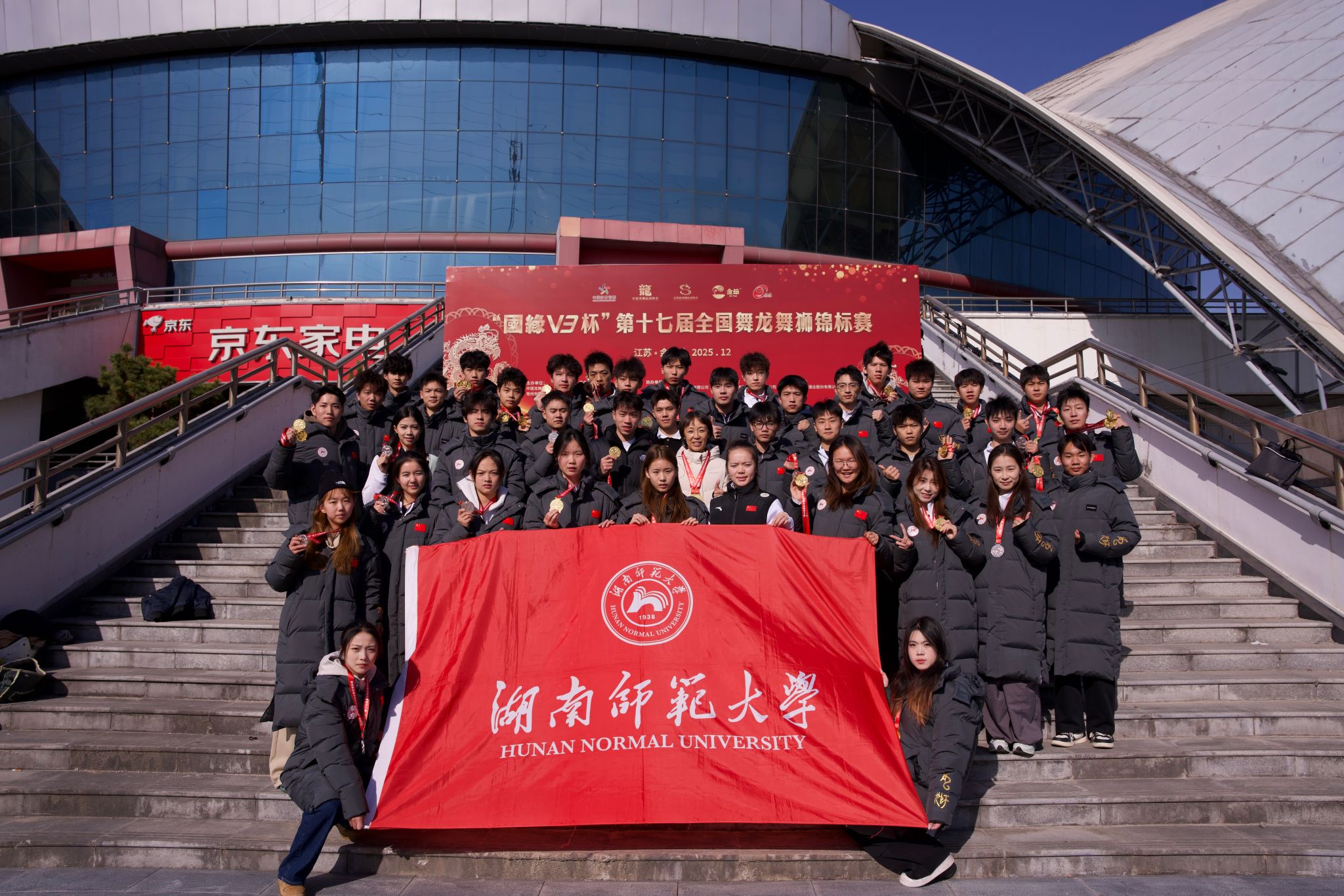 (供稿 体育学院)12月9日,“国缘V3杯”第十七届全国舞龙舞狮锦标赛在江苏常州圆满收官。太阳成集团龙狮团共派出42名运动员,由体育学院党委书记李波担任领队。运动员们发扬龙狮精神、演绎精彩技艺,共斩获两金两银的佳绩,其中男子规定舞龙、传统舞龙项目均获第一名,男子规定北狮、女子自选舞龙项目均获第二名,展现了师大学子的风采与中华文化的魅力。