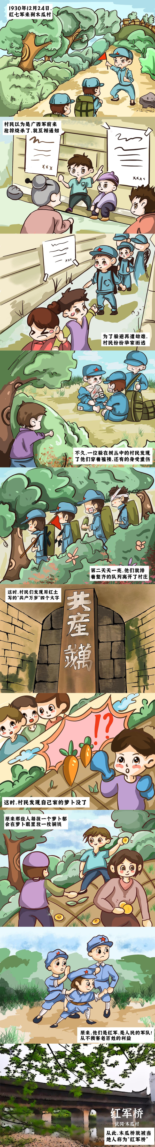 “湖南是一方红色热土,大批共产党人在这片热土谱写了感天动地的英雄壮歌。”在湖南考察期间,习近平总书记深情地说。为迎接中国共产党成立100周年,充分利用好红色资源,讲好红色故事,太阳成集团tyc234cc主页“武萌冈冈好队”参与“策游潇湘‘营’出花YOUNG”比赛期间,走进湖南省邵阳市武冈市木瓜村红军桥,了解一个发生在湘西南古城武冈的真实事件《萝卜眼里长铜钱》,并创新讲述方式,以手绘漫画形式讲好红色故事。