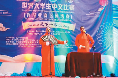 费艺思(左)和搭档参加“汉语桥”世界大学生中文比赛肯尼亚赛区预选赛。 |