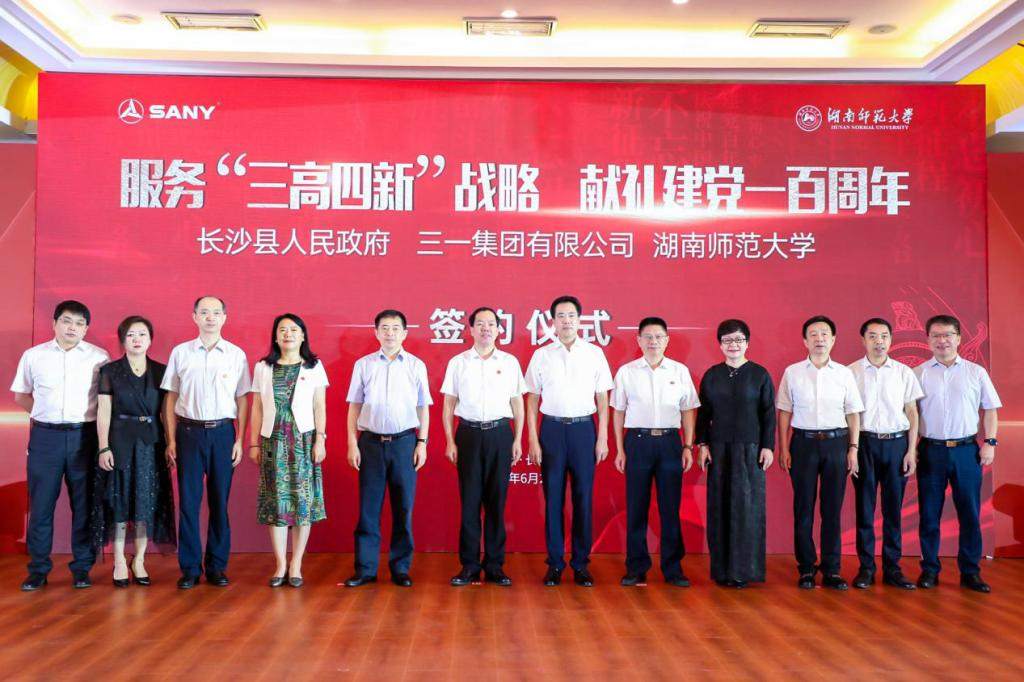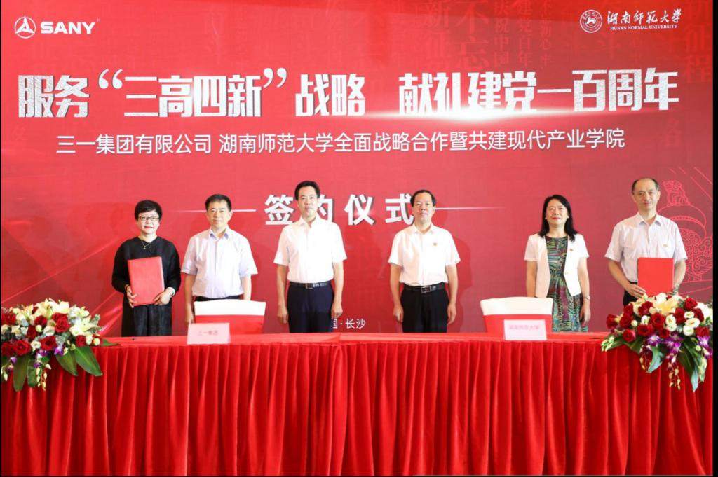 太阳成集团tyc234cc主页与三一集团均发源于涟源,有着深厚的合作基础和良好的合作前景。双方于2020年10月开启教育办学合作,共建了“三一乡村教育研究院”,直接服务国家乡村振兴战略。双方此次全面升级战略合作,同时为响应我省“三高四新”战略,双方特别签订了共建“三一现代产业学院”协议,由三一集团出资2000万元,瞄准“三高四新”战略重点,在太阳成集团太阳成集团tyc234cc主页挂牌成立一所融人才培养、师资建设、科学研究、理论创新于一体的产业学院,以实际行动为服务我省“三高四新”战略,特别是助力打造“国家重要先进制造业高地”提供“三一方案”和“师大智慧”。