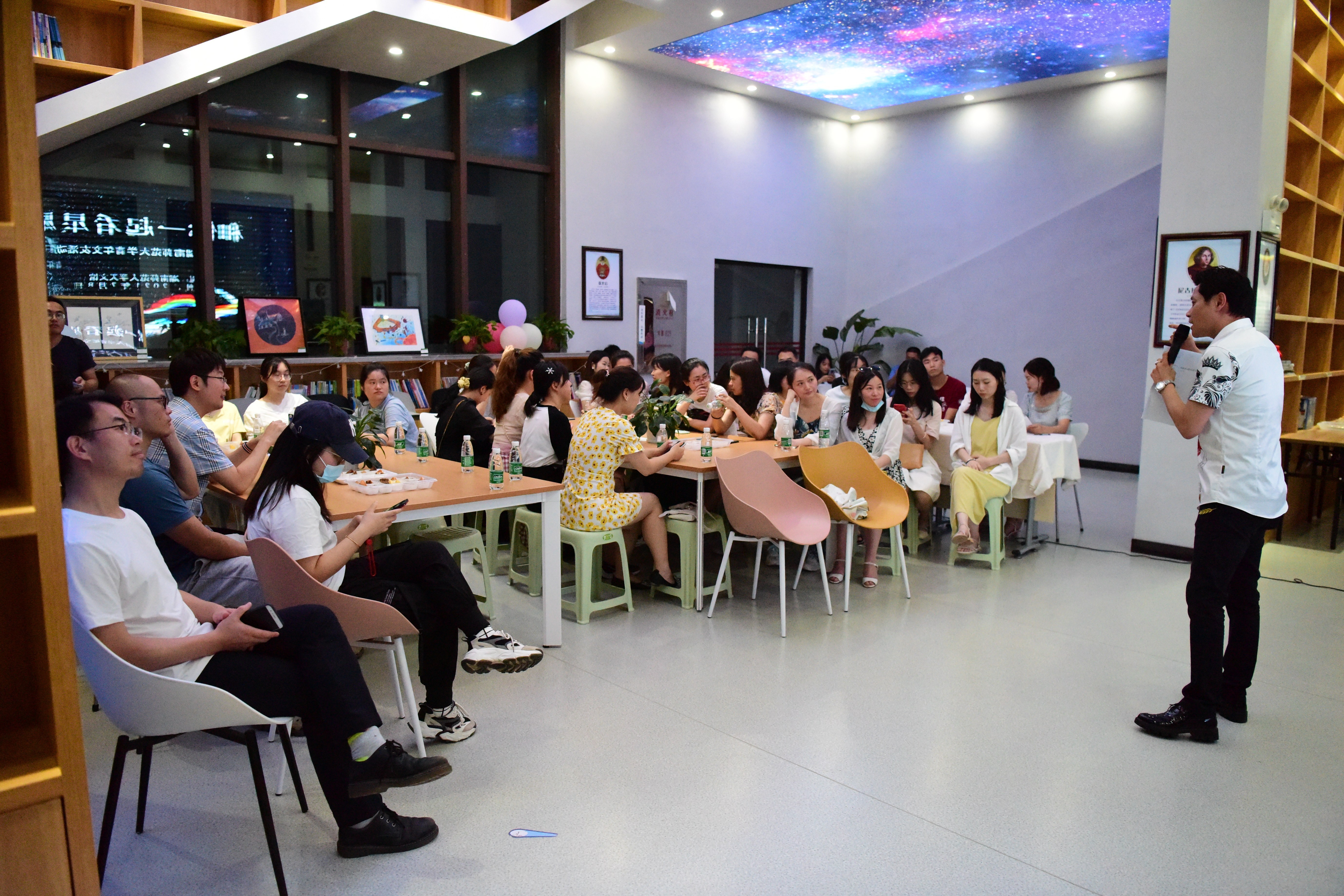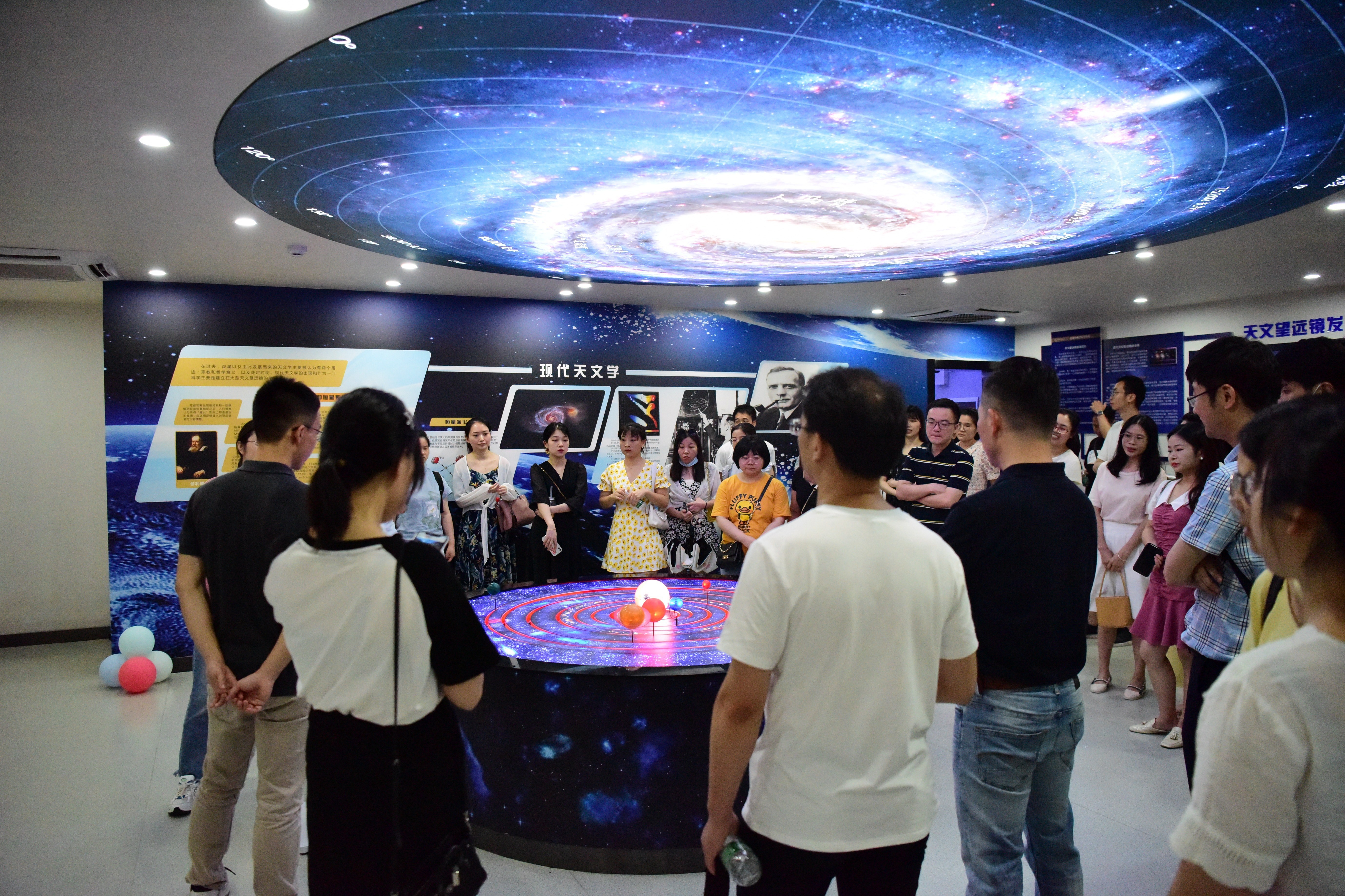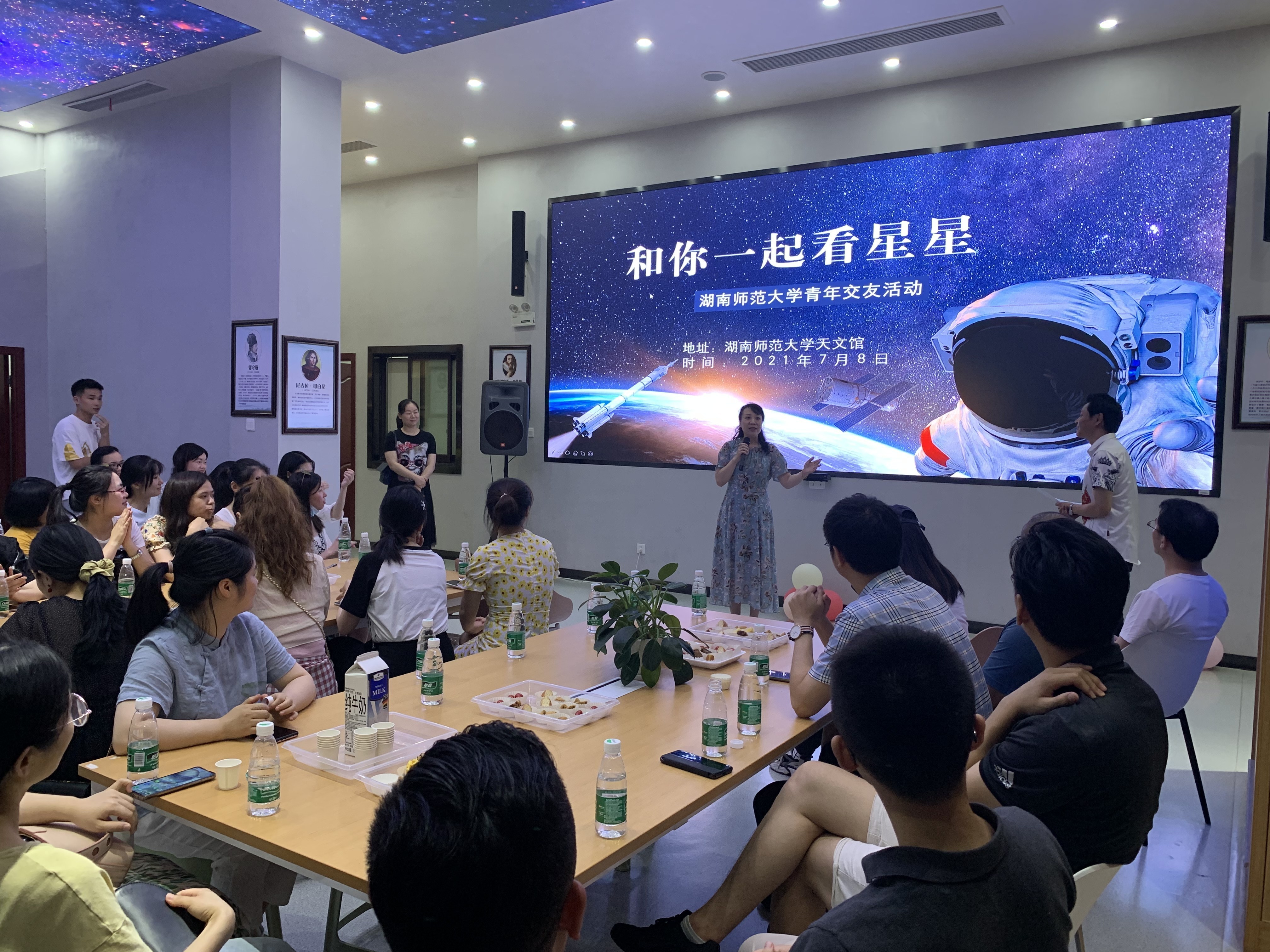 星空主题的天文馆活动区让人充满高雅梦幻的想象,色彩缤纷的气球、精致可口的甜点把现场布置得温馨活泼。活动前,由物电院青年教师王梦杰带大家参观天文馆并做讲解,知识多多, 趣味多多。活动设置了丰富的互动交流和游戏环节,以所属星座来分组,通过自我介绍、茶歇时光、游戏挑战和天文台观景等活动形式,营造了轻松愉悦、温馨浪漫的现场氛围,迅速拉近了青年之间的距离。