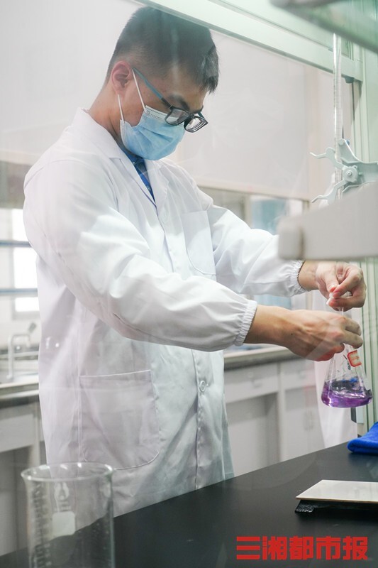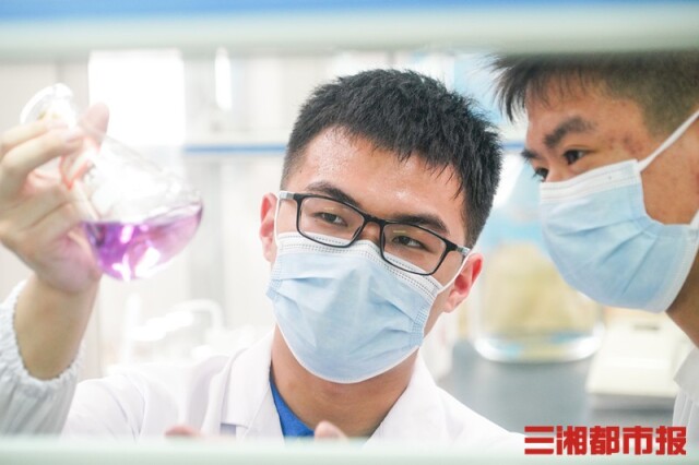 (黄章毅在学校实验室做实验。)