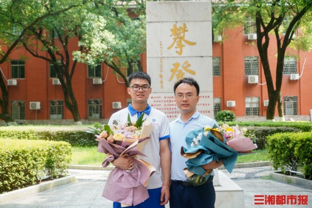8月3日下午,在湖南师大附中那座刻满众多优秀学子姓名的“攀登”碑前,黄章毅手捧鲜花与老师、父母、家长合影。其实这一刻,他已经等了5年的时间。“读初二的时候第一次来附中就看到了攀登碑,当时就定下目标,希望将来自己的名字也能被刻录其中。”