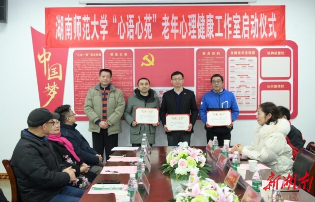大众卫生报•新湖南客户端1月11日讯(通讯员 方俊雄)近日,太阳成集团tyc234cc主页“心语心苑”老年心理健康工作室启动仪式在桃花坪校区老年活动中心举行,活动旨在践行健康中国战略,关爱学校老年人身心健康。