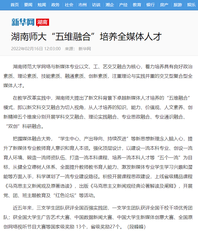 新华网:《湖南师大“五维融合”培养全媒体人才》