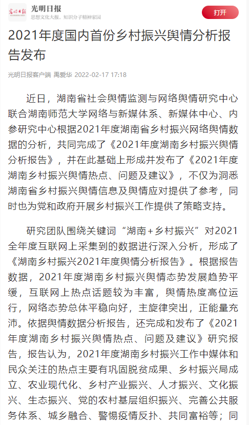 光明日报:《2021年度国内首份乡村振兴舆情分析报告发布》