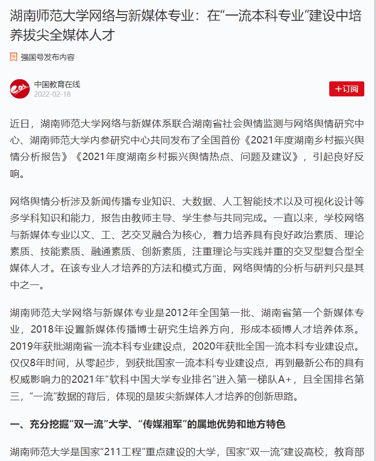 新湖南:湖南师大网络与新媒体专业教育:在“一流本科专业”建设中培养拔尖全媒体人才