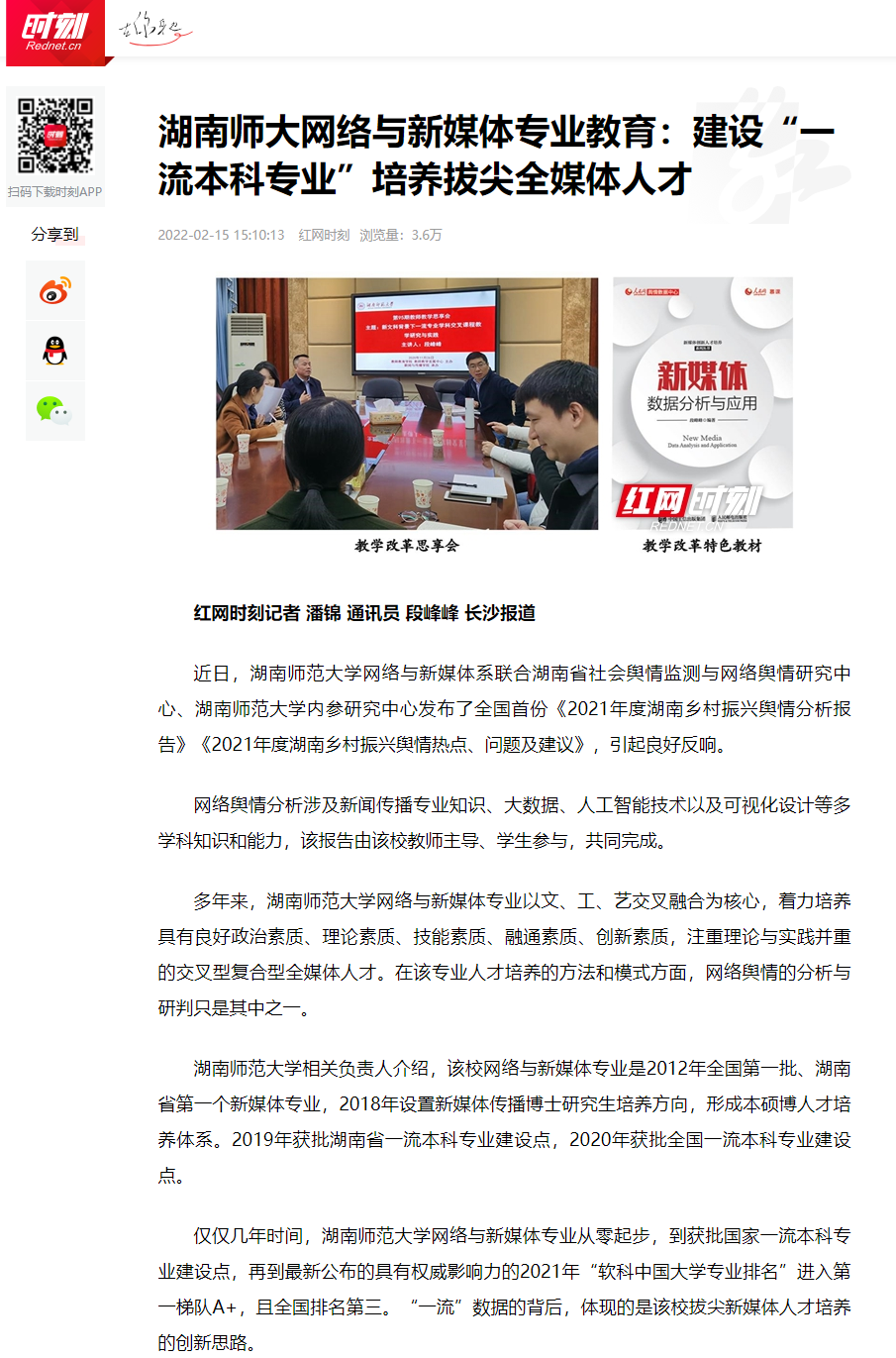红网:湖南师大网络与新媒体专业教育:建设“一流本科专业”培养拔尖全媒体人才