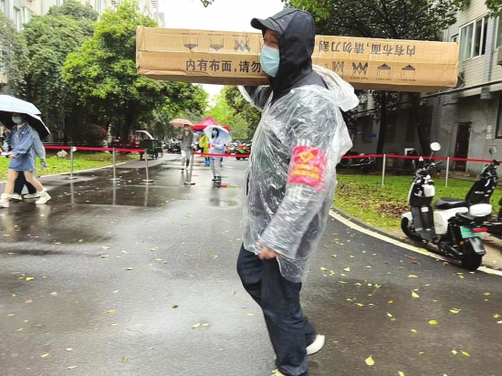 穿着雨衣容易导致工作人员体力透支得很快。一层紧实的防护服套上雨衣后,原本就密不透风的感觉在雨水的冲刷下被加倍放大,防护面屏也模糊了起来,分不清是雨水还是汗水。采集用具和废弃垃圾的携带和处理也成了大问题。队员灵机一动,取来两个黄色医用垃圾袋,拴在腰间。一边放上需要的采集拭子管、消毒酒精,一边充当临时的污物袋。