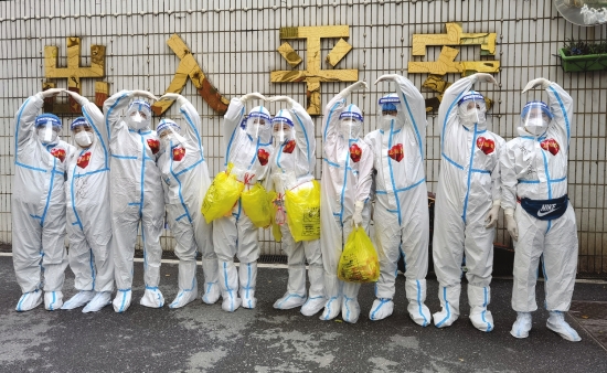 董洁(左四)和队员在电信小区门口合影,后面是四个大字:出入平安。队员身上黄色的袋子,一边装工具一边装垃圾,方便好用。 组图/受访者提供