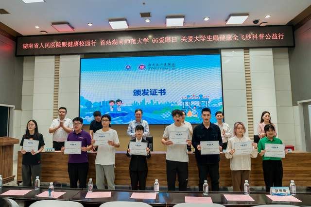 湖南省人民医院党委委员朱华波等为遴选出的8名大学生近视防控宣讲团成员颁发公益证书。化学化工学院2021级本科生姚瑞带头宣誓:作为近视防控“新”力量,将满怀热情地把自己学到的护眼知识,传递给身边的同学和家长,助力中国“视觉健康”!