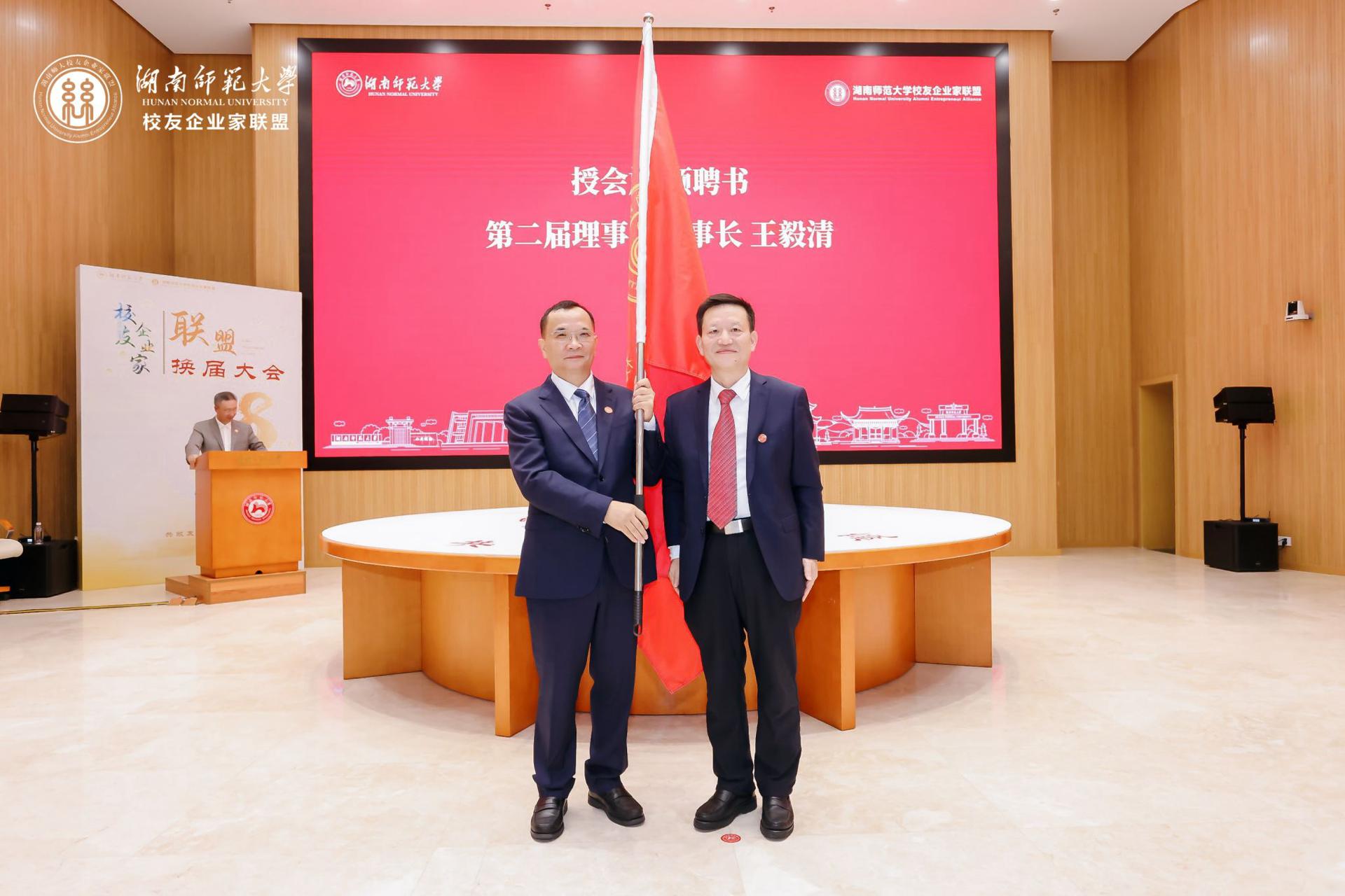 在授旗和颁发聘书环节,蒋洪新向当选理事长王毅清授会旗并颁发聘书,随后与刘仲华共同为第二届理事会成员颁发了聘书。新任理事长王毅清在致辞中表达了对学校领导及全体校友的信任与支持的感谢,并阐述了对未来工作的规划和展望。他表示,新一届联盟理事会及秘书处将不断创新活动形式、合作模式和组织建设,为母校建设和“校友回湘”贡献力量,为实现我省“三高四新”美好蓝图添砖加瓦。