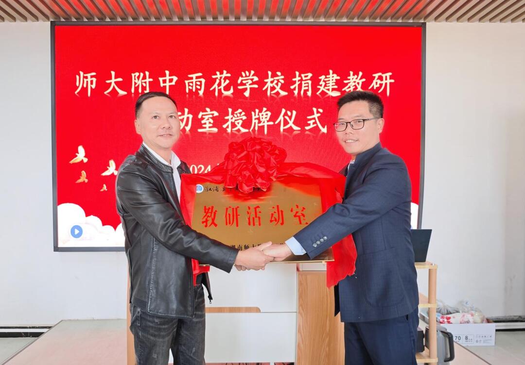 让教研成为一种主动追求,而非被动接受的任务,这是教育进步的关键,而这间新的教研活动室就是最有力的载体。在湖南师大附中雨花学校筹措社会各方力量共同捐建教研活动室的授牌仪式上,刘灵松书记将牌匾郑重地授给中都乡学校向晓坤校长。他深情地说道:“这块牌匾不仅代表着我们两校的深厚友谊,更承载着我们对中都乡教育事业发展的美好祝愿。希望这个教研活动室能成为老师们交流思想、探讨教学方法的宝地,为中都乡培养更多优秀的人才。”