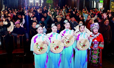 常德河街鸳鸯走马楼,常德丝弦表演团队与现场观众合影互动。潘敬林摄/光明图片