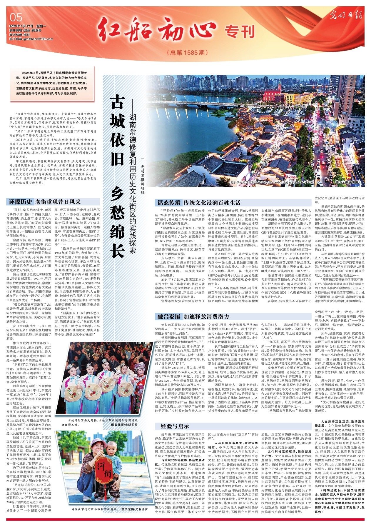牢记殷殷嘱托,常德统筹保护文物资源、历史建筑、城市空间、街巷肌理和生活形态。近年来,常德市探索在保护中发展、在发展中保护,修复利用以河街为核心的历史文化街区,打造城乡历史文化遗产保护传承典范,让历史文化遗产焕发新活力。