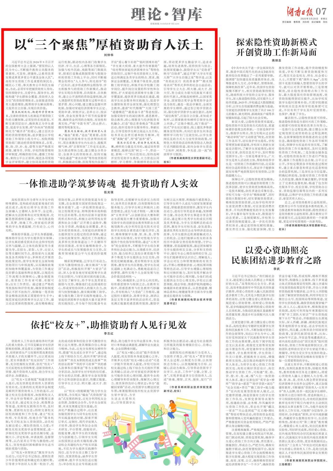 聚焦内生驱动,提升资助育人实效。“输血”重要,“造血”更重要。在给予家庭经济困难学生经济帮扶的同时,须注重激发学生内生动力、提振其精气神,将“志智双扶”工作走实走深。加大联动帮扶力度。建立健全分类分层、全面多元的资助体系,坚持实施“绿色通道”“寒衣补助”等传统资助项目,积极联动后勤、医院等校内各部门开设“爱心餐卡补助”“临时困难补助”“学生重大疾病、重大意外伤害救助”“结对帮扶家庭经济困难学生”等特色资助项目,定制个性化资助育人方案,适应和满足各类学生的特点、需求,既保证全面覆盖,又尊重个体差异。挖潜勤工助学岗位。积极开拓学校勤工助学岗位,提升岗位设置的科学性和合理性,扩大家庭经济困难学生勤工助学覆盖面,提供更多实践成长通道,提高学生社会服务和实践能力,促进学生德智体美劳全面发展。强化理想信念教育。邀请“时代楷模”“大国工匠”“道德模范”“最美奋斗者”等进校园,加强受助学生的诚信教育、感恩教育、励志教育。将心理脱贫与经济脱贫有机融合,打造“励志青春晚会”等品牌活动,组织受助学生服务师生、奉献社会,引导受助学生树立高远人生目标,培养其社会责任感和担当精神,用“爱”熏陶“爱”、用“爱”滋养“爱”。