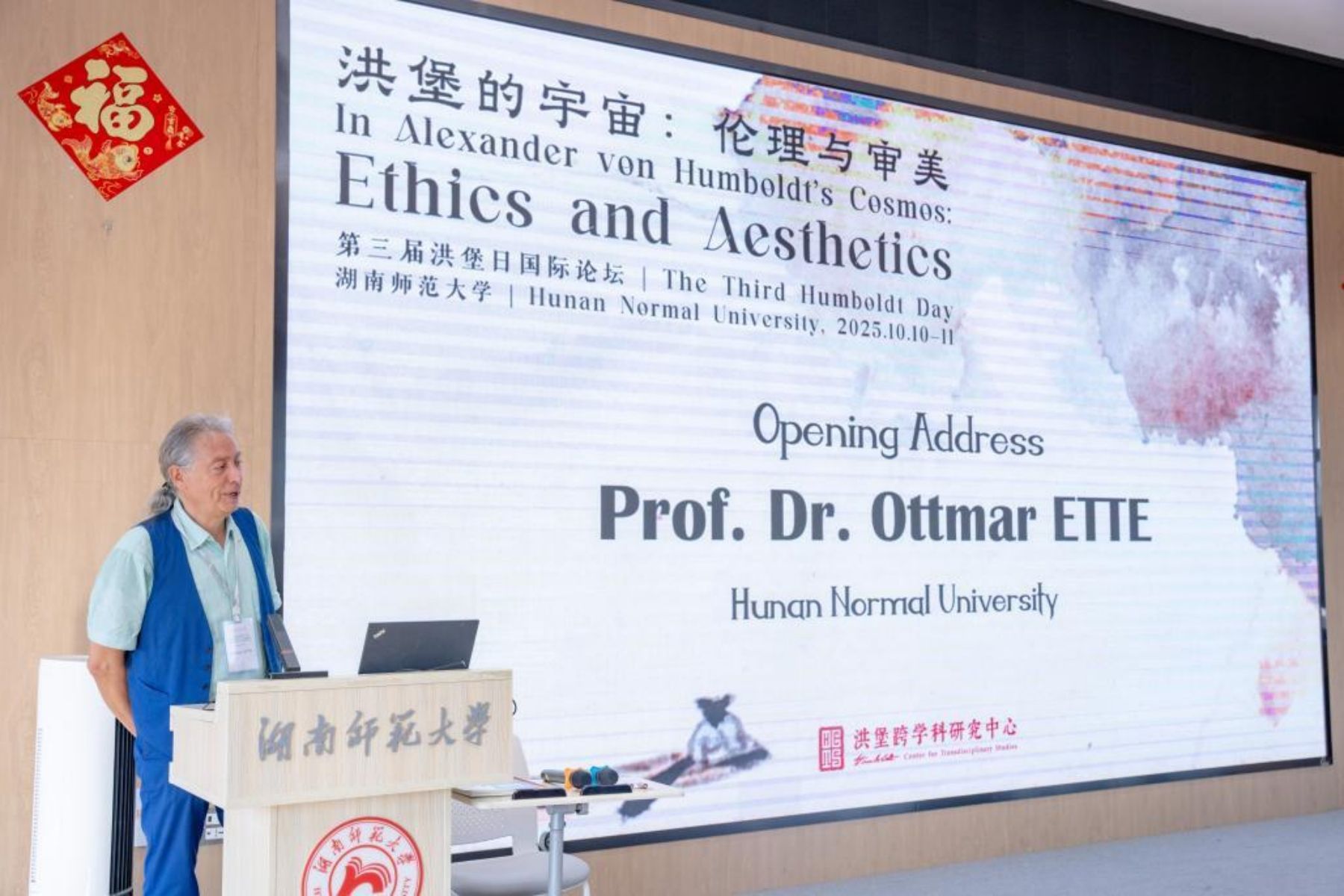 国际比较文学学会前主席、该校“潇湘学者”张隆溪在发言中表示,洪堡的跨学科理念与18世纪有机论相契合,其精神对21世纪全球知识互联具有重要启示。洪堡跨学科研究中心主任、柏林-勃兰登堡科学院院士Ottmar Ette介绍了洪堡研究全球网络的构建情况,并透露第四届洪堡日论坛将于2026年在重庆举办。