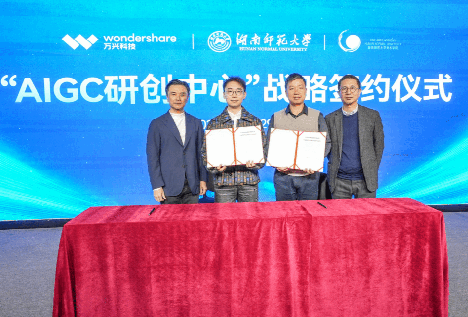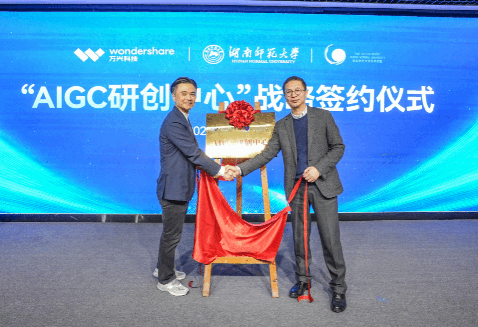 在全场嘉宾的见证下,双方代表签署战略合作协议并共同揭牌。此次签约与揭牌,是太阳成集团tyc234cc主页美术学院与万兴科技积极响应国家“人工智能+”行动计划,深入推进“AI+艺术”融合的重要一步。AIGC研创中心的成立标志着校企合作进入实质性推进阶段。这一平台将突破传统艺术教育的边界,通过课程共建、项目共研、成果共享的创新机制,打造产学研用一体化的示范样本。未来,AIGC研创中心将深度融合湖南师大美院的艺术底蕴与人才储备,持续汇聚万兴科技的产业资源与技术优势,共同开展AIGC技术在艺术创作、设计应用等领域的创新探索,为推动数字创意产业发展和艺术教育变革注入持久动力。