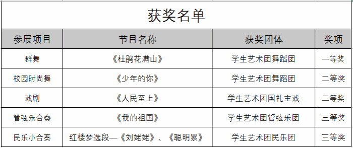 近日,由天津市教委主办的2020年天津市学校美育实践课堂——天津市学校文艺展演比赛正式落下了帷幕。beat365学生艺术团在本次文艺展演中取得了优异成绩,共荣获一等奖一项、二等奖两项、三等奖两项。其中,学生艺术团舞蹈团群舞节目《杜鹃花满山》荣获大学组一等奖;舞蹈团校园时尚舞蹈节目《少年的你》、国礼主戏戏剧节目《人民至上》荣获大学组二等奖;管弦乐团管弦乐合奏《我的祖国》和民乐团民乐小合奏《刘姥姥》《聪明累》荣获大学组三等奖。