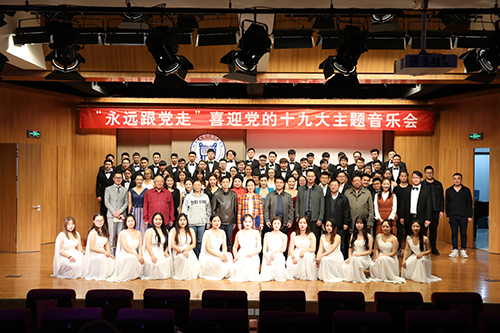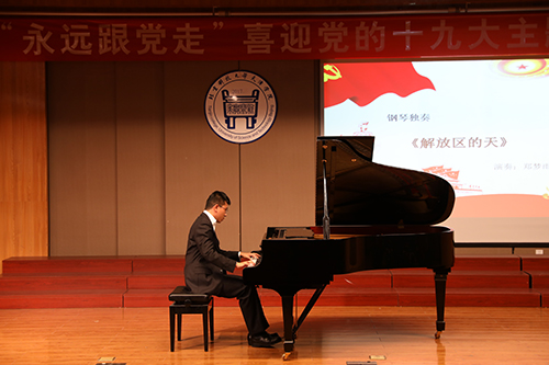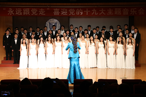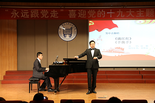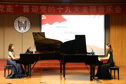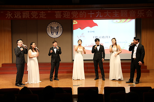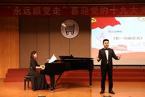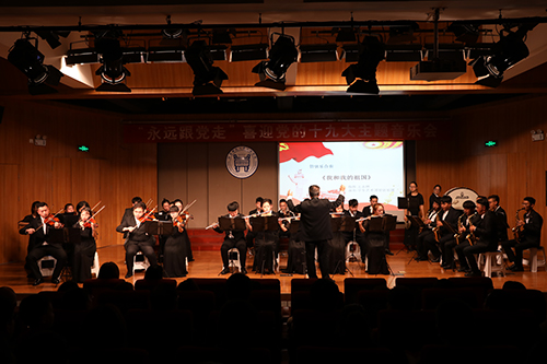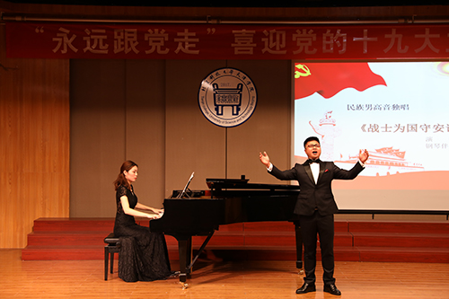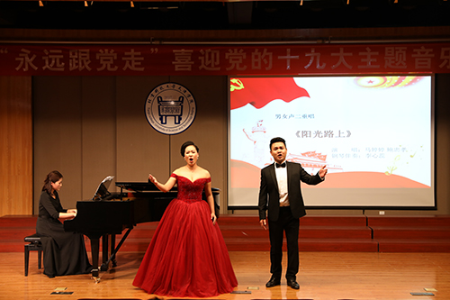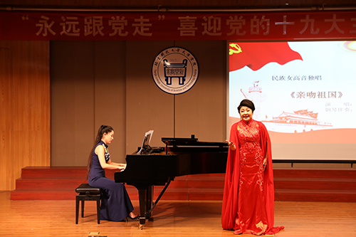 中国共产党第十九次全国代表大会即将在京召开,全院师生以饱满的热情、奋发的精神,为迎接党的十九大胜利召开而高唱凯歌!音乐会在《我和我的祖国》管弦乐合奏中拉开了帷幕。《亲吻祖国》、《红旗颂》、《唱支山歌给党听》、《我爱你中国》等一首首耳熟能详的乐曲徜徉在音乐厅内,久久余音绕梁。整场音乐会以独唱、重唱、合唱、独奏、双钢琴演奏、合奏等多种艺术表演形式,选取广大听众脍炙人口的经典音乐作品,以回顾党的光辉历程,讴歌祖国的飞跃发展,赞美祖国河山的浪漫时尚,展现了一幅把美好的现实与美好的憧憬相融一体的优美画卷,演绎成一部我们党、我们祖国、我们家园的历史回音壁。这些所喜闻乐见的音乐作品带给在场观众感情的波澜和心灵的震颤。一曲曲慷慨激昂的乐曲赢得全场观众的热烈的掌声!
