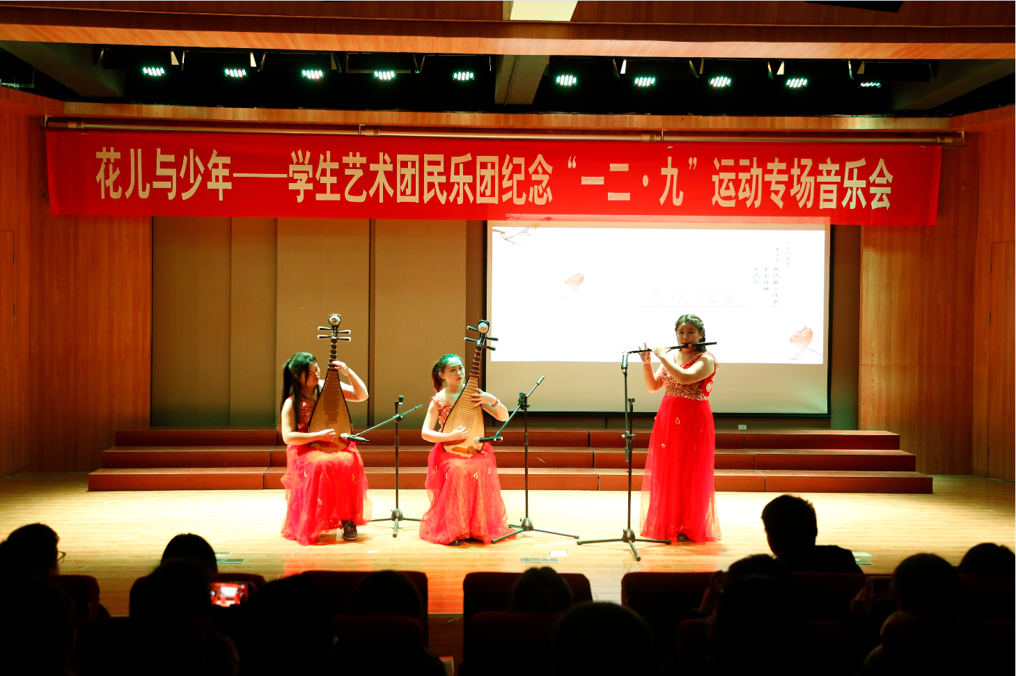 12月6日晚7点,由学院艺术教育中心主办,学生艺术团民乐团承办的“花儿与少年”----学生艺术团民乐团纪念一二.九运动专场音乐会在12教弘艺音乐厅隆重举行。艺术系主任胡建华及艺术教育中心的师生共同观赏了本场音乐会。
