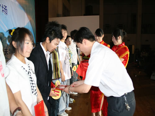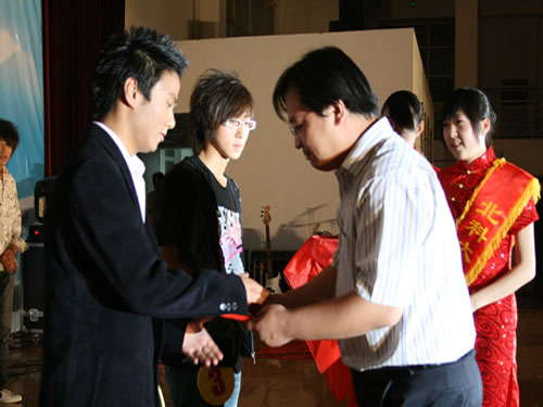学生事务部主任盛佳伟为“校园十佳歌手”颁发奖杯和证书。