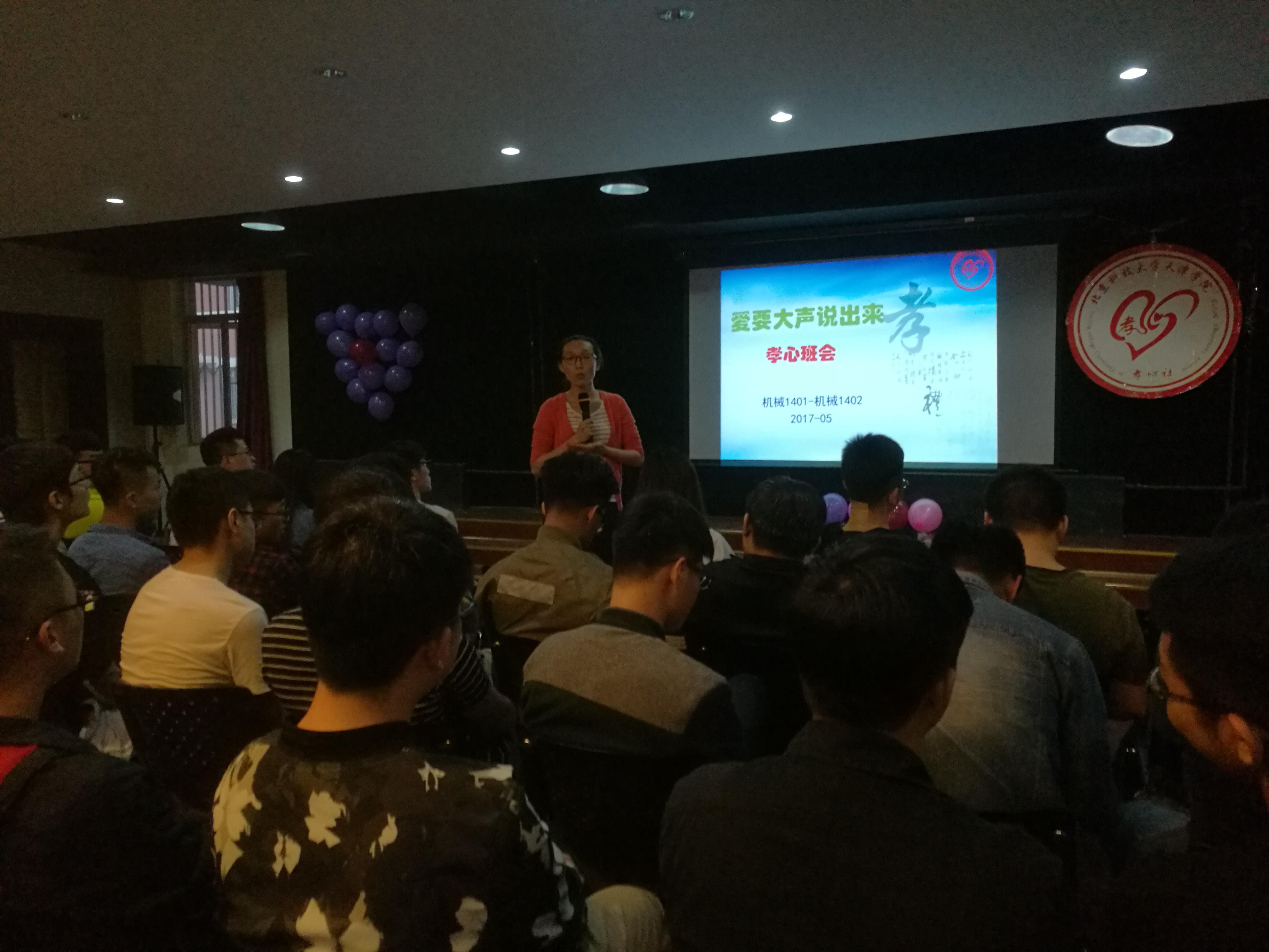 5月2日18点,孝心社主办的“爱要大声说出来”孝道主题教育系列活动在学生活动中心举行,本次活动走进机械系机械1401和1402班。机械系党总支书记郭雅娟,14级学生辅导员尤文婷参加了此次活动。