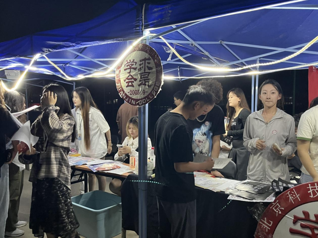 夜幕降临,招新现场依旧熙熙攘攘,光亮的灯带闪耀到每位同学的心中。