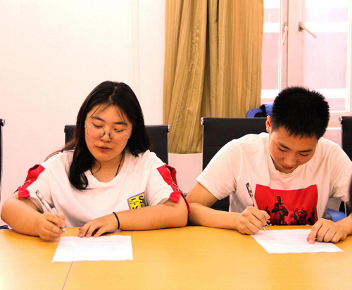 学生干部认真阅读承诺书的考试要求,并在诚信考试承诺书上签下名字,庄重的做出自己的承诺,展现出对诚信考试的严肃性和重视性。