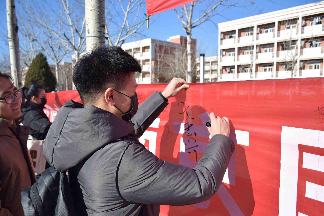 12月13日中午,院学生会组织在小广场进行了“缅怀先烈,勿忘国耻”的主题签名活动。活动虽然在凛冽的寒风中进行,但是也阻挡不了我们北科天院学子们的爱国热情,同学们都积极参与活动,在红色的主题标语上签下自己的名字,表示作为新时代青年用该不忘后事之师,回顾这一惨痛历史,体会遭受侵略和掠夺的苦难,化悲愤为力量,将自己的理想与志向体现到实际行动上,回报逝去的先烈,以主人公的姿态投身到建设祖国的事业中去。